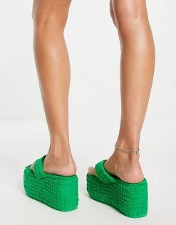 Discount ๐ Public Desire Wide Fit Nell Super Wedge Flip Flops In Green Towelling For Women ๐