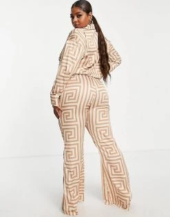Best Pirce ๐ Public Desire Curve Satin Printed Trouser Co Ord Suit In Brown Geo For Women โญ
