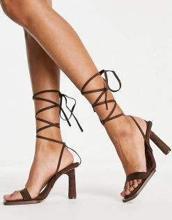 Outlet 💯 Public Desire Wide Fit Lamour Square Rand Heel 🩴 Sandals In Chocolate For Women ✔️